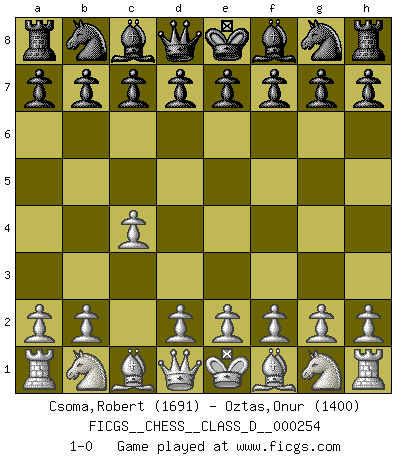 Last move : 1-0 2019 May 31 22:50:19 [Event "FICGS__CHESS__CLASS_D__000254"] [Site "FICGS"] [Date "2019.04.21"] [Round "1"] [White "Csoma,Robert"] [Black "Oztas,Onur"] [Result "1-0"] [WhiteElo "1691"] [BlackElo "1400"] 1.c4 1-0 This chess game has been lost on time (started : 2019.04.21 19:54:17) English Opening Player White won this chess game. Follow this game move after move (download)You cannot play at Chess if you are kind-hearted. (French Proverb) Ich liebe den Moment, wenn ich das Ego meines Gegenüber breche. (Robert James Fischer) Creo que una cierta cantidad de temperamento es esperada de los genios del Ajedrez. (Ron Gross) Vous m'avez demandé de vous exposer quel est le fondement de la prière. Je ne fais que préparer les pièces du jeu sur la table... Nous sera-t-il permis d'en adopter les règles et si nous les appliquons scrupuleusement nous ne tarderons pas à faire mat le Roi divin ! Il ne pourra échapper à nos mains. (Sainte Thérèse d'Avila, Chemin de perfection) Always remember that you are unique; just like everyone else. (Unknown)