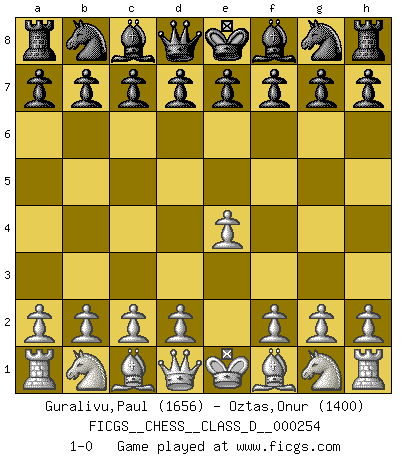 Last move : 1-0 2019 June 1 22:49:22 [Event "FICGS__CHESS__CLASS_D__000254"] [Site "FICGS"] [Date "2019.04.21"] [Round "1"] [White "Guralivu,Paul"] [Black "Oztas,Onur"] [Result "1-0"] [WhiteElo "1656"] [BlackElo "1400"] 1.e4 1-0 This chess game has been lost on time (started : 2019.04.21 19:54:17) King's pawn Opening Player White won this chess game. Follow this game move after move (download)Some sacrifices are sound; the rest are mine. (Mikhail Tal) Du musst nicht gut spielen, es reicht, wenn du besser spielst als dein Gegner. (Anonymous) Entre mas años cumplo, mas valoro los Peones. (Keres) RxDa4 pat (...) You think that education is too expensive ? Try ignorance. (Derek Bok)