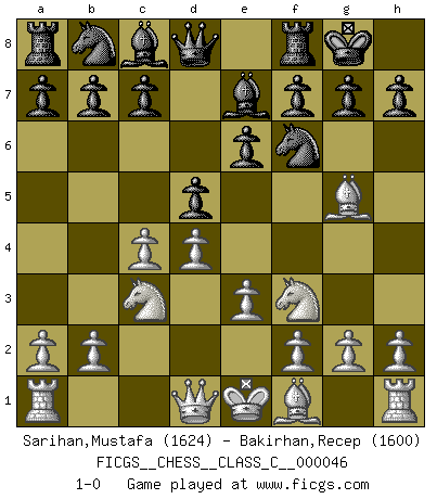 Last move : 1-0 2007 July 23 0:22:12 [Event "FICGS__CHESS__CLASS_C__000046"] [Site "FICGS"] [Date "2007.06.09"] [Round "1"] [White "Sarihan,Mustafa"] [Black "Bakirhan,Recep"] [Result "1-0"] [WhiteElo "1624"] [BlackElo "1600"] 1.d4 Nf6 2.c4 e6 3.Nf3 d5 4.Nc3 Be7 5.Bg5 O-O 6.e3 1-0 This chess game has been lost on time (started : 2007.06.09 16:49:55) Queen's pawn game Kingside Castling by player Black (move 5) Player White won this chess game. Follow this game move after move (download)After a bad opening, there is hope for the middle game. After a bad middle game, there is hope for the endgame. But once you are in the endgame, the moment of truth has arrived. (Edmar Mednis) Die westlichen Werte sind eine Sprache, welche die Putin-Administration nicht versteht. (Garry Kasparov) Yo jugué Ajedrez con el y a veces le pude haber ganado solo que siempre devuelve su última jugada y juega la partida de manera diferente. (Mark Twain) Plusieurs personnes se sont demandées comment Tal faisait pour gagner... En fait, c'est très simple ! Il met ses pièces au centre de l'échiquier et les sacrifie quelque part ! (David Bronstein) If we knew what we were doing, we would not call it research. (Albert Einstein)