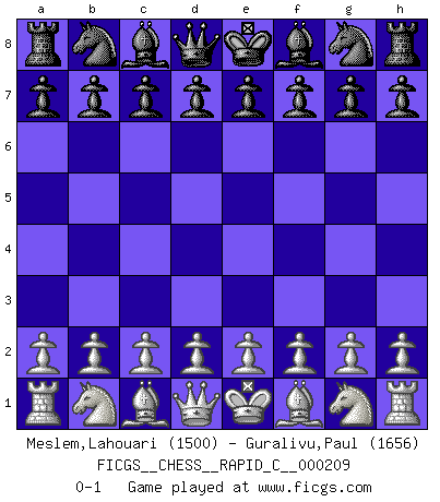 Last move : 0-1 2019 May 24 21:54:39 [Event "FICGS__CHESS__RAPID_C__000209"] [Site "FICGS"] [Date "2019.04.24"] [Round "1"] [White "Meslem,Lahouari"] [Black "Guralivu,Paul"] [Result "0-1"] [WhiteElo "1500"] [BlackElo "1656"] 0-1 This chess game has been lost on time (started : 2019.04.24 17:48:35) Player Black won this chess game. Follow this game move after move (download)Those who say they understand Chess, understand nothing. (Robert Hubner) Dass jemand wie Surab Asmaiparaschwili, der selbst Elopunkte gekauft hat , Vize-Präsident der Fide werden konnte, sagt schon einges über den Zustand dieser Organisation aus. (Joel Lautier) Todo se encuentra en un estado de flujo y esto incluye al mundo del Ajedrez. (Mikhail Botvinnik) Roi des jeux et jeu des rois, les échecs portent en eux un sentiment d'infini. Ils donnent à celui qui s'est efforcé d'en approfondir les arcanes l'impression de n'être pas à la mesure de l'homme; en fait, ils constituent un résumé de l'univers, un microcosme, et figurent cette grande échelle qui, dans les plans de la lumière descend jusqu'à la matière, qui des abîmes insondables remonte jusqu'en l'infini de Dieu. (Pyrame) Even the best needles are not sharp at both ends. (Chinese proverb)