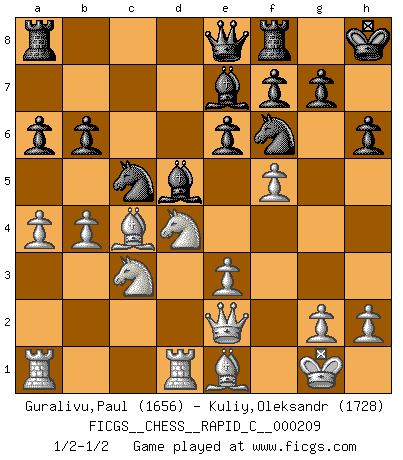 Last move : 1/2-1/2 2019 May 12 21:16:5 [Event "FICGS__CHESS__RAPID_C__000209"] [Site "FICGS"] [Date "2019.04.24"] [Round "1"] [White "Guralivu,Paul"] [Black "Kuliy,Oleksandr"] [Result "1/2-1/2"] [WhiteElo "1656"] [BlackElo "1728"] 1.d4 d5 2.c4 e6 3.Nc3 Nf6 4.Nf3 Be7 5.Bg5 h6 6.Bh4 O-O 7.e3 Nbd7 8.Bd3 dxc4 9.Bxc4 a6 10.a4 b6 11.O-O Bb7 12.Qe2 c5 13.Rfd1 cxd4 14.Nxd4 Qe8 15.f4 Nc5 16.f5 Kh8 17.Be1 Bd5 18.b4 1/2-1/2 QGD : 4.Nf3 Kingside Castling by player Black (move 6) Kingside Castling by player White (move 11) This chess game ended in a draw. Follow this game move after move (download)The chessboard is the world, the pieces are the phenomena of the Universe, the rules of the game are what we call the laws of Nature and the player on the other side is hidden from us. (Thomas Huxley) Schach ist gnadenlos. Du mußt bereit sein zu töten. (Nigel Short) Un Peón pasado aumenta su poder a medida de que el número de piezas en el tablero disminuye. (Capablanca) Vous n'êtes pas toujours obligé de jouer le meilleur coup. Un coup doit être actif, entreprenant, correct et beau ! (David Bronstein) Secret operations are essential in war; upon them the army relies to make its every move. (Sun Tzu)