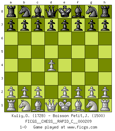 Last move : 1-0 2019 May 24 21:54:39 [Event "FICGS__CHESS__RAPID_C__000209"] [Site "FICGS"] [Date "2019.04.24"] [Round "1"] [White "Kuliy,Oleksandr"] [Black "Boisson Petit,Janus"] [Result "1-0"] [WhiteElo "1728"] [BlackElo "1500"] 1.d4 1-0 This chess game has been lost on time (started : 2019.04.24 17:48:35) Queen's pawn Player White won this chess game. Follow this game move after move (download)A Chess game is divided into three stages: the first, when you hope you have the advantage, the second when you believe you have an advantage, and the third... when you know you're going to lose ! (Savielly Tartakower) Ich kenne Menschen, die allen Willen der Welt besitzen und doch nicht Schach spielen können. (Robert James Fischer) El jugador de combinación piensa hacia adelante; comienza de la posición dada y trabaja las movidas contundentes en su mente. (Emanuel Lasker) Karpov est une pièce de musée. (Garry Kasparov) Bobby never cared about money, though. His only desire was to prove that his choices were correct: He wanted chess to be important because he was a chess player, and he wanted to be important. Bobby knew money was important, but he didn't have a clue why, outside of clothes and status. The only way he could accomplish what he wanted was to fight for a lot of money. Once he got it, he gave it away. He did not know how to spend it. And once he'd become champion, after, essentially, sacrificing his life for it, he didn't know how to spend his time. (Bob Wade)