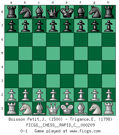 Last move : 0-1 2019 May 24 21:54:39 [Event "FICGS__CHESS__RAPID_C__000209"] [Site "FICGS"] [Date "2019.04.24"] [Round "1"] [White "Boisson Petit,Janus"] [Black "Trigance,Emile"] [Result "0-1"] [WhiteElo "1500"] [BlackElo "1798"] 0-1 This chess game has been lost on time (started : 2019.04.24 17:48:35) Player Black won this chess game. Follow this game move after move (download)Chess is a forcing house where the fruits of character can ripen more fully than in life. (Edward Morgan Foster) Wenn Du absolut nicht mehr weißt, was Du tun sollst, dann ist es Zeit für Panik. (John van der Wiel) El Ajedrez es tan interesante por sí solo, que no es necesario un interés monetario para persuadir a una persona a que lo practique; por lo tanto, nunca se juega por dinero. (Benjamin Franklin) Le pion, dans sa simplicité, marche droit devant lui, mais lorsqu'il prend, il le fait obliquement? Ainsi l'homme, tant qu'il reste pauvre, marche dans la droiture et vit honnêtement, mais lorsqu'il recherche les honneurs, il flatte, se parjure et, par les voies obliques, cherche une position supérieure sur l'échiquier du monde. (Jean de Galles) The message for business people contemplating their place in the cyberspace is simple and direct: get linked or get lost. (Vic Sussman and Kenan Pollack)