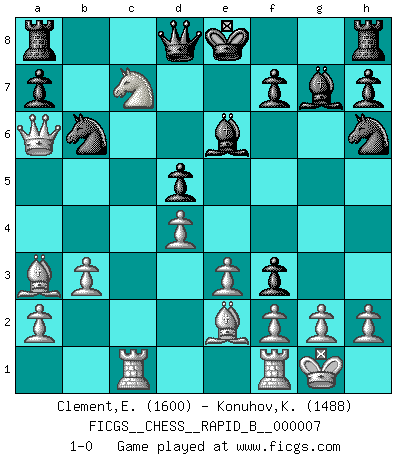 Last move : 1-0 2006 June 27 12:56:55 [Event "FICGS__CHESS__RAPID_B__000007"] [Site "FICGS"] [Date "2006.06.14"] [Round "1"] [White "Clement,Etienne"] [Black "Konuhov,Konstantin"] [Result "1-0"] [WhiteElo "1600"] [BlackElo "1488"] 1.c4 g6 2.Nf3 Bg7 3.Nc3 Nh6 4.e3 d6 5.Be2 Nc6 6.d4 e6 7.O-O d5 8.cxd5 exd5 9.Qb3 Be6 10.Qxb7 Na5 11.Qa6 Nc4 12.b3 Nb6 13.Ba3 g5 14.Rac1 g4 15.Nb5 gxf3 16.Nxc7+ 1-0 English Opening Kingside Castling by player White (move 7) Player White won this chess game. Follow this game move after move (download)Chess is imagination. (David Bronstein) Wenn es im Universum noch irgendwo intelligente Lebewesen gibt, dann kennen sie Go. (Emanuel Lasker) Las leyes del Ajedrez no permiten una libre elección: tienes que mover quieras o no. (Emanuel Lasker) Avant la finale, les dieux ont créé le milieu de partie. (Tarrasch) No, no, you're not thinking; you're just being logical. (Niels Bohr)