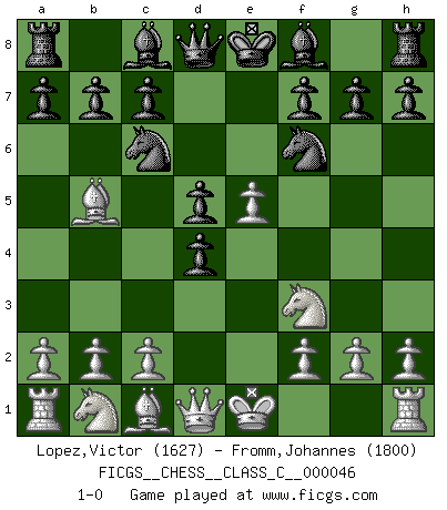 Last move : 1-0 2007 September 23 21:36:28 [Event "FICGS__CHESS__CLASS_C__000046"] [Site "FICGS"] [Date "2007.06.09"] [Round "1"] [White "Lopez,Victor"] [Black "Fromm,Johannes"] [Result "1-0"] [WhiteElo "1627"] [BlackElo "1800"] 1.e4 e5 2.Nf3 Nc6 3.Bc4 Nf6 4.d4 exd4 5.e5 d5 6.Bb5 1-0 This chess game has been lost on time (started : 2007.06.09 16:49:55) Two knights defense Player White won this chess game. Follow this game move after move (download)For me, Chess is life and every game is like a new life. Every Chess player gets to live many lives in one lifetime. (Eduard Gufeld) Wir können eben der zündenden Macht des Opfers nicht wiederstehen, denn die Begeisterung für das Opfer liegt in der Natur des Menschen. (Rudolf Spielmann) Evita las multitudes. Haz independientemente tu propio razonamiento. Trata de ser el jugador de Ajedrez, no la pieza de Ajedrez. (Ralph Charell) Demandez au pauvre Cg1 ce qu'il en pense. Eduard Gufeld à propos de la variante Saemisch de l'Est-Indienne. At last I discovered the true beauty of chess. So I proposed to her. (Dinesh De Silva)