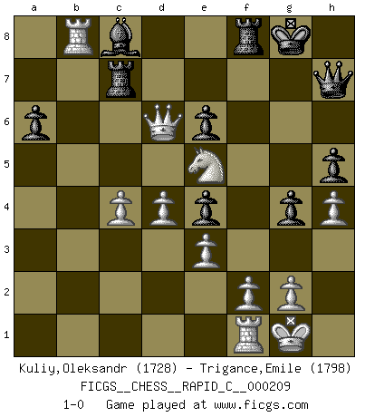Last move : 1-0 2019 May 20 11:58:1 [Event "FICGS__CHESS__RAPID_C__000209"] [Site "FICGS"] [Date "2019.04.24"] [Round "1"] [White "Kuliy,Oleksandr"] [Black "Trigance,Emile"] [Result "1-0"] [WhiteElo "1728"] [BlackElo "1798"] 1.d4 d5 2.Nf3 e6 3.Bf4 f5 4.e3 Nf6 5.h3 Be7 6.c4 c6 7.Nc3 O-O 8.Bd3 Nbd7 9.cxd5 Nxd5 10.Bh2 N7f6 11.Rc1 Qe8 12.O-O Bd7 13.Ne5 Rd8 14.Kh1 Bc8 15.Qb3 Nd7 16.Nf3 N7f6 17.Rfe1 Nxc3 18.bxc3 Qg6 19.Kg1 Bd6 20.Bxd6 Rxd6 21.Qa3 Rfd8 22.Qxa7 Ne4 23.Bxe4 fxe4 24.Ne5 Qf5 25.c4 Rf8 26.Rf1 R6d8 27.a4 h5 28.Qb6 g5 29.a5 g4 30.h4 Qh7 31.a6 bxa6 32.Qxc6 Rde8 33.Rb1 Re7 34.Rb8 Rc7 35.Qd6 1-0 Queen's pawn game Kingside Castling by player Black (move 7) Kingside Castling by player White (move 12) Player White won this chess game. Follow this game move after move (download)To avoid losing a piece, many a person has lost the game. (Savielly Tartakover) Schach ist das schnellste Spiel der Welt, weil man in jeder Sekunde Tausende von Gedanken ordnen muß. (Albert Einstein) Muchos se han convertido en Maestros de Ajedrez, nadie se ha convertido en el Maestro del Ajedrez. (Siegbert Tarrasch) C'est une question de caractère, Beaucoup de gens perdent leur motivation très vite. D'autres, ils sont rares, peuvent la conserver très longtemps. J'aime les échecs, encore aujourd'hui je suis heureux d'analyser des parties. J'aime toujours gagner, je déteste encore perdre. Bien jouer est important pour mon intégrité intellectuelle et morale. Et puis les échecs vivent en ce moment une période historique grâce à Internet. Ils se développent dans les systèmes éducatifs à travers le monde. Ils sortent de leur ghetto, et c'est mon rôle de mener à bien cette révolution. (Gary Kasparov) They say poker is a zero-sum game. It must be, because every time I play my sum ends up zero. (Max Shapiro)