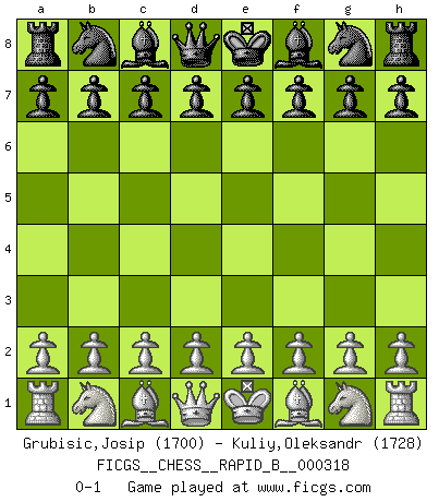 Last move : 0-1 2019 May 27 22:14:28 [Event "FICGS__CHESS__RAPID_B__000318"] [Site "FICGS"] [Date "2019.04.27"] [Round "1"] [White "Grubisic,Josip"] [Black "Kuliy,Oleksandr"] [Result "0-1"] [WhiteElo "1700"] [BlackElo "1728"] 0-1 This chess game has been lost on time (started : 2019.04.27 17:5:23) Player Black won this chess game. Follow this game move after move (download)My style is somewhere between that of Tal and Petrosian. (Reshevsky) Ein Großmeister muß tausende Partien in seinem Kopf speichern, denn diese sind für Ihn, was die Worte der Muttersprache für gewöhnliche Leute sind, oder Noten für Musiker... (Garry Kasparov) Aún el Rey más flojo huye despavorido ante la amenaza de un Jaque doble. (Aaron Nimzowitsch) Fischer est le meilleur joueur du monde et Karpov n'est qu'un joueur de bistrot. (Garry Kasparov, agé de 16 ans) Nowadays, anyone who cannot speak English and is incapable of using the Internet is regarded as backward. (Al-Waleed bin Talal)