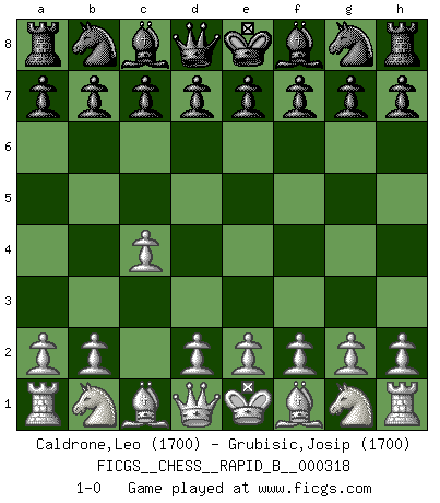 Last move : 1-0 2019 May 27 22:14:28 [Event "FICGS__CHESS__RAPID_B__000318"] [Site "FICGS"] [Date "2019.04.27"] [Round "1"] [White "Caldrone,Leo"] [Black "Grubisic,Josip"] [Result "1-0"] [WhiteElo "1700"] [BlackElo "1700"] 1.c4 1-0 This chess game has been lost on time (started : 2019.04.27 17:5:23) English Opening Player White won this chess game. Follow this game move after move (download)Live, lose, and learn, by observing your opponent how to win. (Amber Steenbock) Die jungen Leute sollen verstehen, dass sie noch etwas von mir lernen können und müssen. (Viktor Kortschnoi) ¿Esta Bobby Fischer algo cuerdo?. (Salo Flohr) Le jeu d'échecs est comme rejeté hors du temps. (Antoine de Saint-Exupéry) If everyone is thinking alike, then somebody isn't thinking. (US General George S. Patton)