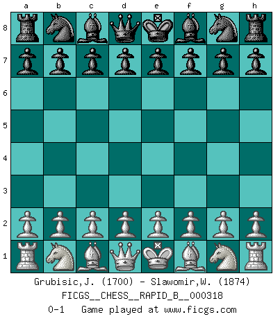 Last move : 0-1 2019 May 27 22:14:28 [Event "FICGS__CHESS__RAPID_B__000318"] [Site "FICGS"] [Date "2019.04.27"] [Round "1"] [White "Grubisic,Josip"] [Black "Slawomir,Weglicki"] [Result "0-1"] [WhiteElo "1700"] [BlackElo "1874"] 0-1 This chess game has been lost on time (started : 2019.04.27 17:5:23) Player Black won this chess game. Follow this game move after move (download)When you are lonely, when you feel yourself an alien in the world, play Chess. This will raise your spirits and be your counselor in war. (Aristotle) Wenn sie aufgeben, dann danke ich Ihnen für das Spiel (Eventualzug beim Fernschach). (Anonymous) ¿Porque tengo que perder ante este idiota?. (Aron Nimzovich) La conception d'un plan est le processus par lequel un joueur exploite les avantages de sa position tout en s'efforçant d'en réduire au minimum les inconvénients. Afin de garantir le succès, un plan doit toujours se fonder sur un diagnostic objectif des particularités d'une position. La conception d'un plan est d'autant plus difficile que la position est équilibrée, et grandement facilitée lorsqu'il n'existe qu'un seul plan susceptible de répondre aux exigences de la position. (Harry Golombek) Humor is by far the most significant activity of the human brain. (Edward De Bono)