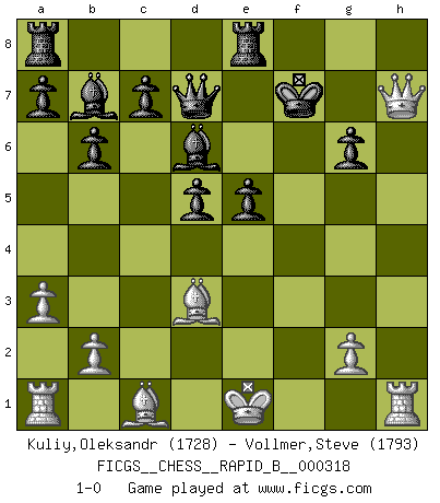 Last move : 1-0 2019 May 5 17:38:59 [Event "FICGS__CHESS__RAPID_B__000318"] [Site "FICGS"] [Date "2019.04.27"] [Round "1"] [White "Kuliy,Oleksandr"] [Black "Vollmer,Steve"] [Result "1-0"] [WhiteElo "1728"] [BlackElo "1793"] 1.d4 e6 2.Nf3 b6 3.c4 Bb7 4.a3 Nf6 5.Nc3 Be7 6.d5 exd5 7.cxd5 O-O 8.e4 Na6 9.Bc4 Nc5 10.e5 Nfe4 11.Nxe4 Nxe4 12.Qc2 Ng5 13.Nd4 Re8 14.h4 Ne4 15.Qxe4 Bd6 16.f4 f6 17.Nc6 Qc8 18.Bd3 g6 19.h5 fxe5 20.f5 dxc6 21.hxg6 cxd5 22.Qh4 Qd7 23.f6 hxg6 24.f7+ Kxf7 25.Qh7+ 1-0 Queen's pawn Kingside Castling by player Black (move 7) Player White won this chess game. Follow this game move after move (download)In a gambit you give up a Pawn for the sake of getting a lost game. (Samuel Standige Boden) Es macht mich traurig, wenn ich sehe, dass Golfprofis mehr verdienen als Schachsportler. Obwohl ich davon überzeugt bin, dass wir Schachspieler viel härter trainieren müssen als die Golfer. (Alexandra Kosteniuk) El Ajedrez es una manera fabulosa para que los niños aprendan a autovalorarse y a autoestimarse. (Saudin Robovic) Des points faibles ou des trous dans la position de l'adversaire doivent être occupés par des pièces et non pas par des pions. (Siegbert Tarrasch) Memory is a complicated thing, a relative to truth, but not its twin. (Barbara Kingsolver, Animal Dreams)