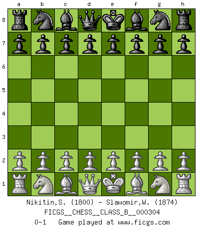 Last move : 0-1 2019 June 7 14:16:4 [Event "FICGS__CHESS__CLASS_B__000304"] [Site "FICGS"] [Date "2019.04.27"] [Round "1"] [White "Nikitin,Sergey"] [Black "Slawomir,Weglicki"] [Result "0-1"] [WhiteElo "1800"] [BlackElo "1874"] 0-1 This chess game has been lost on time (started : 2019.04.27 23:45:51) Player Black won this chess game. Follow this game move after move (download)You cannot play at Chess if you are kind-hearted. (French Proverb) Darum geht es im Schach. Einen Tag gibst du deinem Gegner eine Lektion, am nächsten Tag gibt er dir eine. (Robert James Fischer) Con o sin el título, Bobby Fischer fue sin lugar a dudas el mas grande jugador de su época. (Burt Hochberg) Il s'avisa de me proposer d'apprendre les échecs qu'il jouait un peu... me voilà forcené des échecs. J'achète un échiquier, je m'enferme dans ma chambre, j'y passe des jours et des nuits à vouloir apprendre par cur toutes les parties. (Jean-Jacques Rousseau, Confessions) The meaning of life is that it is to be lived, and it is not to be traded and conceptualized and squeezed into a pattern of systems. (Bruce Lee)