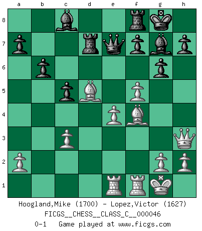 Last move : 0-1 2008 January 10 23:4:48 [Event "FICGS__CHESS__CLASS_C__000046"] [Site "FICGS"] [Date "2007.06.09"] [Round "1"] [White "Hoogland,Mike"] [Black "Lopez,Victor"] [Result "0-1"] [WhiteElo "1700"] [BlackElo "1627"] 1.d4 Nf6 2.c4 g6 3.Nc3 d5 4.Nf3 Bg7 5.cxd5 Nxd5 6.e4 Nxc3 7.bxc3 c5 8.Rb1 O-O 9.Be2 Nc6 10.d5 Ne5 11.Nxe5 Bxe5 12.Qd2 Bg7 13.O-O b6 14.f4 e6 15.Bc4 exd5 16.Bxd5 Rb8 17.f5 Bb7 18.Qd3 Qe7 19.Bf4 Rbd8 20.Rbe1 Rd7 21.Qh3 Bc8 0-1 This chess game has been lost on time (started : 2007.06.09 16:49:55) King's Indian defense, 3.Nc3 Kingside Castling by player Black (move 8) Kingside Castling by player White (move 13) Player Black won this chess game. Follow this game move after move (download)Good offense and good defense both begin with good development. (Bruce A. Moon) Besser ein falscher Plan, logisch durchgeführt, als gar kein Plan. (Viktor Kortschnoi) La partida mas dura de ganar es una partida ganada. (Emanuel Lasker) Les réformistes prétendent que les progrès de la théorie conduiront à la disparition des échecs, et qu'il faut, pour leur rendre vie, en remanier les règles. En réalité, qu'exprime cette affirmation? Le mépris de l'intuition, de l'imagination et de tous les autres éléments qui font des échecs un art. (Alexander Alekhine) There is a great deal of difference between an eager man who wants to read a book and a tired man who wants a book to read. (G.K. Chesterton)