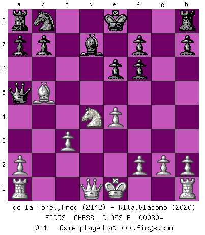Last move : 0-1 2019 July 19 23:3:36 [Event "FICGS__CHESS__CLASS_B__000304"] [Site "FICGS"] [Date "2019.04.27"] [Round "1"] [White "de la Foret,Fred"] [Black "Rita,Giacomo"] [Result "0-1"] [WhiteElo "2142"] [BlackElo "2020"] 1.d4 Nf6 2.c4 e6 3.Nf3 d5 4.Nc3 dxc4 5.e4 Bb4 6.Bg5 c5 7.Bxc4 cxd4 8.Nxd4 Bxc3+ 9.bxc3 Qa5 10.Bb5+ Bd7 11.Bxf6 gxf6 0-1 Queen's pawn game Player Black won this chess game. Follow this game move after move (download)It is always better to sacrifice your opponent's men. (Savielly Tartakower) Die Elozahlen sind sehr schlecht für das Schach. Jetzt ist Schach eine Sportindustrie, die darauf zielt Elopunkte zu machen. (Miguel Najdorf) Yo tuve un dolor de muelas en la primer partida. En el segundo juego, tuve un dolor de cabeza. En el tercero, tuve un ataque de reumatísmo. En la cuarta partida, no me sentía muy bien. ¿Y en el quinto juego? Bueno, ¿que acaso uno tiene que ganar todos los juegos?. (Siegbert Tarrasch) Même un GMI sait rarement calculer sur plus de cinq coups une attaque à sacrifices. (Rudolf Spielmann) This is where the fun begins. (Anakin Skywalker in Star Wars ep.3)