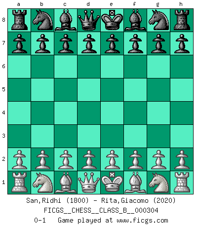 Last move : 0-1 2019 June 7 14:16:4 [Event "FICGS__CHESS__CLASS_B__000304"] [Site "FICGS"] [Date "2019.04.27"] [Round "1"] [White "San,Ridhi"] [Black "Rita,Giacomo"] [Result "0-1"] [WhiteElo "1800"] [BlackElo "2020"] 0-1 This chess game has been lost on time (started : 2019.04.27 23:45:51) Player Black won this chess game. Follow this game move after move (download)In Chess, as it is played by masters, chance is practically eliminated. (Emanuel Lasker) Aljechin war kein Nazi. Er war ein Opportunist. Ein schrecklicher Mann. Er liebte Geld über alles und würde für Geld ein Jude, ein Katolik oder ein Protestant werden. (Miguel Najdorf) Si tu oponente no puede hacer nada activo, entonces no apures la posición; En vez de eso, dejalo estar sentado ahí, sufriendo y rogandote por un empate. (Jeremy Silman) Aux échecs, l'amour-propre est satisfait quand on remporte la victoire, mais il n'y a pas de honte à être battu. (Benjamin Franklin) In theory there is no difference between theory and practice. In practice there is. (Yogi Berra)