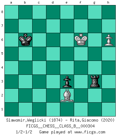 Last move : 1/2-1/2 2019 June 30 11:6:38 [Event "FICGS__CHESS__CLASS_B__000304"] [Site "FICGS"] [Date "2019.04.27"] [Round "1"] [White "Slawomir,Weglicki"] [Black "Rita,Giacomo"] [Result "1/2-1/2"] [WhiteElo "1874"] [BlackElo "2020"] 1.e4 c5 2.Nf3 d6 3.d4 cxd4 4.Nxd4 Nf6 5.Nc3 a6 6.Be3 e5 7.Nb3 Be6 8.Be2 Be7 9.O-O O-O 10.Qd3 Nc6 11.a3 Nd7 12.Rad1 Rc8 13.Rfe1 f5 14.exf5 Bxf5 15.Qd2 Nf6 16.Nd5 Qe8 17.c4 Qf7 18.Nxf6+ Bxf6 19.Na5 Rcd8 20.Bb6 Rd7 21.Nxc6 bxc6 22.b4 Rb8 23.Be3 Qg6 24.Rc1 R7d8 25.Qd1 Qf7 26.Bh5 Qd7 27.Be2 Qe6 28.Qa4 Rdc8 29.Red1 Kh8 30.h3 h6 31.Kh1 Ra8 32.Kg1 Rab8 33.Re1 Ra8 34.Bf1 Qf7 35.Red1 d5 36.cxd5 cxd5 37.Rxc8+ Bxc8 38.Rc1 Bb7 39.Qa5 Bd8 40.Bb6 Qf4 41.Rc2 Bh4 42.Be3 Qf5 43.Rc7 Bd8 44.Qb6 Bxc7 45.Qxb7 Rf8 46.Qxd5 Rd8 47.Qc6 Rd1 48.Qxa6 Bd6 49.Qb5 Qc2 50.Kh2 Qb1 51.Qa6 Kh7 52.Kg1 e4 53.g3 Qd3 54.Kg2 Qxa6 55.Bxa6 Kg6 56.b5 Bxa3 57.b6 Bd6 58.Bb7 Kf5 59.Bc8+ Ke5 60.h4 Rb1 61.h5 Rb2 62.Kh3 Be7 63.Bf4+ Kd5 64.b7 Bd6 65.Be3 Rb5 66.Kg4 Kc6 67.Bd4 Rg5+ 68.Kh4 Be7 69.g4 Rb5 70.Kg3 Rb3+ 71.Kf4 Kd5 72.Be3 Bc5 73.g5 Bxe3+ 74.fxe3 hxg5+ 75.Kxg5 Kc6 76.Kg6 Kc7 77.Kxg7 Rxe3 78.h6 Rg3+ 79.Kf6 e3 80.b8Q+ Kxb8 81.Ba6 Ka7 82.Be2 Kb6 1/2-1/2 Sicilian : Najdorf, Byrne (English) attack Kingside Castling by player White (move 9) Kingside Castling by player Black (move 9) 10 pieces endgame at move 74 : White KBPPP , Black KRPPP WHITE : King + 1 Bishop 3 Pawns BLACK : King + 1 Rook 3 Pawns 9 pieces endgame at move 75 : White KBPPP , Black KRPP WHITE : King + 1 Bishop 3 Pawns BLACK : King + 1 Rook 2 Pawns 8 pieces endgame at move 77 : White KBPPP , Black KRP WHITE : King + 1 Bishop 3 Pawns BLACK : King + 1 Rook 1 Pawn 7 pieces endgame at move 77 : White KBPP , Black KRP WHITE : King + 1 Bishop 2 Pawns BLACK : King + 1 Rook 1 Pawn Promotion Queen by player White (move 80) 6 pieces endgame at move 80 : White KBP , Black KRP WHITE : King + 1 Bishop 1 Pawn BLACK : King + 1 Rook 1 Pawn This chess game ended in a draw. Follow this game move after move (download)Fischer Chess play was always razor-sharp, rational and brilliant. One of the best ever. (Dave Regis) Mit Schach schule ich mein Gefühl für Geometrie, was für Tennis und Schach gleichermaßen wichtig ist. (Boris Becker) Algunos sacrificios son sólidos, los demás son míos. (Mikhail Tal) J'apprécie les joueurs d'est-indienne, c'est grâce à eux que je nourris ma famille depuis tant d'années. (Petrosian) It is not true that people stop pursuing dreams because they grow old, they grow old because they stop pursuing dreams. (Gabriel Garcia Marquez)