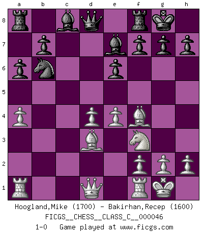 Last move : 1-0 2007 August 13 15:27:46 [Event "FICGS__CHESS__CLASS_C__000046"] [Site "FICGS"] [Date "2007.06.09"] [Round "1"] [White "Hoogland,Mike"] [Black "Bakirhan,Recep"] [Result "1-0"] [WhiteElo "1700"] [BlackElo "1600"] 1.d4 Nf6 2.c4 e6 3.Nf3 d5 4.Nc3 c5 5.cxd5 Nxd5 6.e4 Nxc3 7.bxc3 Be7 8.Bc4 O-O 9.O-O a6 10.a4 cxd4 11.cxd4 Nd7 12.Bf4 Nb6 13.Bd3 1-0 Queen's pawn game Kingside Castling by player Black (move 8) Kingside Castling by player White (move 9) Player White won this chess game. Follow this game move after move (download)Personally, I rather look forward to a computer program winning the world Chess Championship. Humanity needs a lesson in humility. (Richard Dawkings) Jeder weiß, dass Gasprom Putins persönliches Machtinstrument ist. Die Firma wird vom Kreml aus geleitet und wird schon deshalb nie transparent sein. (Garry Kasparov) Mi estilo es algo parecido entre un poco de Tal y Petrosian. (Reshevsky) Celui qui prend des risques peut perdre, celui qui n'en prend pas perd toujours. (Xavier Tartacover) Somewhere in the world there is an epigram for every dilemma. (Hendrik Willem van Loon)