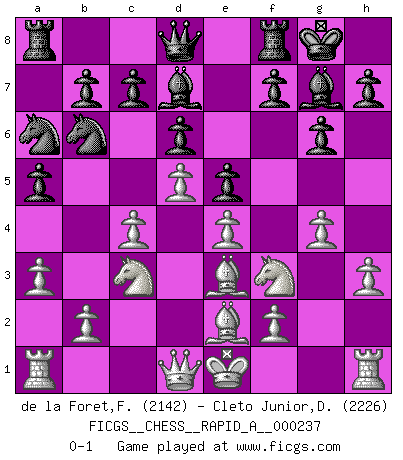 Last move : 0-1 2019 June 13 0:24:54 [Event "FICGS__CHESS__RAPID_A__000237"] [Site "FICGS"] [Date "2019.04.30"] [Round "1"] [White "de la Foret,Fred"] [Black "Cleto Junior,Dirceu"] [Result "0-1"] [WhiteElo "2142"] [BlackElo "2226"] 1.d4 Nf6 2.c4 d6 3.Nf3 g6 4.Nc3 Bg7 5.h3 O-O 6.e4 e5 7.d5 a5 8.g4 Na6 9.Be3 Nd7 10.a3 Nb6 11.Be2 Bd7 0-1 This chess game has been lost on time (started : 2019.04.30 1:11:18) Old Indian defense Kingside Castling by player Black (move 5) Player Black won this chess game. Follow this game move after move (download)Many have become Chess Masters, no one has become the Master of Chess. (Siegbert Tarrasch) Mein Name ist Rustam Kamsky. Sie haben meinen Sohn belästigt. Bereiten Sie sich aufs Sterben vor. (Rustam Kamsky) Yo tuve un dolor de muelas en la primer partida. En el segundo juego, tuve un dolor de cabeza. En el tercero, tuve un ataque de reumatísmo. En la cuarta partida, no me sentía muy bien. ¿Y en el quinto juego? Bueno, ¿que acaso uno tiene que ganar todos los juegos?. (Siegbert Tarrasch) D'abord les bases : Jouez et étudiez, puis étudiez et jouez, ensuite jouez et étudiez, puis étudiez et jouez. Deuxièmement : Donnez toujours le meilleur de vous-même ! (Ken Smith) Don't be irreplaceable, if you can't be replaced, you can't be promoted. (Dan Rotaru)