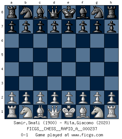 Last move : 0-1 2019 May 30 10:39:4 [Event "FICGS__CHESS__RAPID_A__000237"] [Site "FICGS"] [Date "2019.04.30"] [Round "1"] [White "Samir,Smati"] [Black "Rita,Giacomo"] [Result "0-1"] [WhiteElo "1900"] [BlackElo "2020"] 0-1 This chess game has been lost on time (started : 2019.04.30 1:11:18) Player Black won this chess game. Follow this game move after move (download)I am the best player in the world and I am here to prove it. (Bobby Fischer) Über Kasparov: Es ist offensichtlich, daß er in einem totalitären Staat aufwuchs und deshalb zu diktatorischen Zügen neigt. (Viktor Kortschnoi) Hoy en día, si tu no eres un Gran Maestro a los 14 años, es mejor que lo olvides. (Anand Viswanathan) Il n'y a pas de prix trop élevé au scalp de l'ennemi. (Koblentz) Difficult things take a long time, impossible things a little longer. (Author unknown)