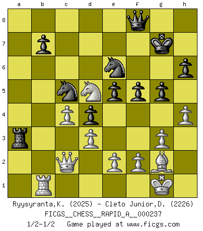 Last move : 1/2-1/2 2019 May 10 17:30:55 [Event "FICGS__CHESS__RAPID_A__000237"] [Site "FICGS"] [Date "2019.04.30"] [Round "1"] [White "Ryysyranta,Kaaleppi"] [Black "Cleto Junior,Dirceu"] [Result "1/2-1/2"] [WhiteElo "2025"] [BlackElo "2226"] 1.Nf3 d5 2.c4 d4 3.g3 Nc6 4.Bg2 e5 5.d3 Bb4+ 6.Bd2 a5 7.O-O Nf6 8.Na3 O-O 9.Bxb4 axb4 10.Nc2 Qe7 11.a3 bxa3 12.Nxa3 Bg4 13.Nc2 Nd7 14.Qe1 h6 15.Rxa8 Rxa8 16.b4 Nd8 17.Qb1 c5 18.h3 Bh5 19.bxc5 Nxc5 20.Nb4 f5 21.Re1 Bxf3 22.Bxf3 Qd6 23.Nd5 Nde6 24.Rd1 Kh7 25.h4 Qf8 26.Bg2 Ra3 27.Rf1 g6 28.Qc2 Kg7 29.Rb1 g5 1/2-1/2 Reti : Advance variation Kingside Castling by player White (move 7) Kingside Castling by player Black (move 8) This chess game ended in a draw. Follow this game move after move (download)By playing at Chess then, we may learn: First: Foresight... Second: Circumspection... Third: Caution... And lastly, we learn by Chess the habit of not being discouraged by present bad appearances in the state of our affairs, the habit of hoping for a favorable chance, and that of persevering in the secrets of resources. (Benjamin Franklin) Alle Schachspieler sollten auch ein Hobby haben. (Savielly Grigorievitsch Tartakower) El hombre es un frívolo, una creatura engañosa y como un jugador de Ajedrez, se preocupa mas por el proceso de obtener su meta que de la meta por sí misma. (Dostoyevsky) Nous vivons dans un monde échiquéen : chaque jour qui passe est un défi à relever. (Philosophe Sasha) Everybody lies. (Gregory House, House M.D.)