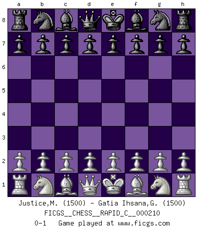 Last move : 0-1 2019 May 30 22:44:9 [Event "FICGS__CHESS__RAPID_C__000210"] [Site "FICGS"] [Date "2019.04.30"] [Round "1"] [White "Justice,Michael"] [Black "Gatia Ihsana,Gatia"] [Result "0-1"] [WhiteElo "1500"] [BlackElo "1500"] 0-1 This chess game has been lost on time (started : 2019.04.30 12:53:3) Player Black won this chess game. Follow this game move after move (download)You need not play well - just help your opponent to play badly. (Genrikh Chepukaitis) Ich verstehe den Grund nicht, warum die Aufteilung in Frauen und Männer überhaupt im Schach besteht. (Judith Polgar) Cuando no sepas que mover, espera por una idea que se le venga a la la cabeza de tu oponente. Tenlo por seguro de que esa idea estará incorrecta. (Siegbert Tarrasch) Le génie consiste à savoir transgresser les règles au moment opportun. (Teichmann) A good player is always lucky. (Capablanca)