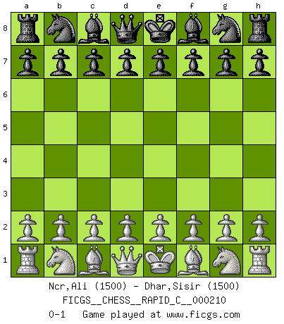 Last move : 0-1 2019 May 30 22:44:9 [Event "FICGS__CHESS__RAPID_C__000210"] [Site "FICGS"] [Date "2019.04.30"] [Round "1"] [White "Ncr,Ali"] [Black "Dhar,Sisir"] [Result "0-1"] [WhiteElo "1500"] [BlackElo "1500"] 0-1 This chess game has been lost on time (started : 2019.04.30 12:53:3) Player Black won this chess game. Follow this game move after move (download)Chess teaches you to control the initial excitement you feel when you see something that looks good and it trains you to think objectively when you're in trouble. (Stanley Kubrick) Ein typischer, sehr verbreiteter Gedankenschädling ist der, daß der betreffende Amateur von der Annanhme ausgeht, daß jeder einzelne Zug etwas zu leisten habe. (Aaron Nimzowitsch) Solo el jugador con la iniciativa tiene el derecho a atacar. (Wilhelm Steinitz) Aucun coup ne doit être joué sans but. (Pedro Damiano) Those parts of the system that you can hit with a hammer (not advised) are called hardware; those program instructions that you can only curse at are called software. (Anonymous)