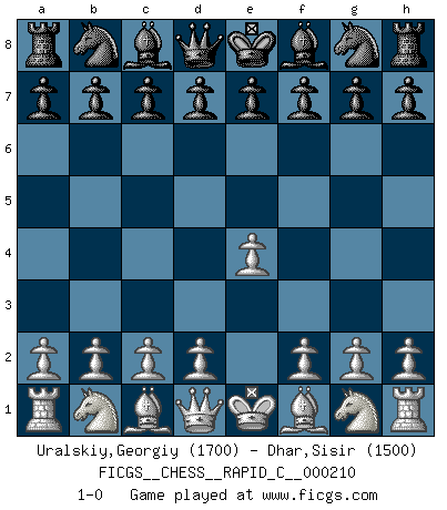 Last move : 1-0 2019 June 8 2:20:18 [Event "FICGS__CHESS__RAPID_C__000210"] [Site "FICGS"] [Date "2019.04.30"] [Round "1"] [White "Uralskiy,Georgiy"] [Black "Dhar,Sisir"] [Result "1-0"] [WhiteElo "1700"] [BlackElo "1500"] 1.e4 1-0 This chess game has been lost on time (started : 2019.04.30 12:53:3) King's pawn Opening Player White won this chess game. Follow this game move after move (download)The only thing Chess players have in common is Chess. (Lodewijk Prins) Ivan Sokolov treibt mich als Beifahrer an mit go Loeky go - . (Loek van Wely) Las leyes del Ajedrez no permiten una libre elección: tienes que mover quieras o no. (Emanuel Lasker) Les Echecs mettent en conflit, non pas deux intelligences, mais deux volontés. (Lasker) Memory is a complicated thing, a relative to truth, but not its twin. (Barbara Kingsolver, Animal Dreams)