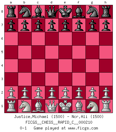 Last move : 0-1 2019 May 30 22:44:9 [Event "FICGS__CHESS__RAPID_C__000210"] [Site "FICGS"] [Date "2019.04.30"] [Round "1"] [White "Justice,Michael"] [Black "Ncr,Ali"] [Result "0-1"] [WhiteElo "1500"] [BlackElo "1500"] 0-1 This chess game has been lost on time (started : 2019.04.30 12:53:3) Player Black won this chess game. Follow this game move after move (download)Life is like a game of Chess, changing with each move. (Chinese proverb) Computer sind die einzigen Gegner, die nicht immer eine Ausrede auf Lager haben, wenn sie gegen mich verlieren. (Robert James Fischer) La última cosa en que Fischer estaba interesado era en tonterías, siempre y cuando el Ajedrez estuviera involucrado. (Elie Agur) Aux échecs, l'amour-propre est satisfait quand on remporte la victoire, mais il n'y a pas de honte à être battu. (Benjamin Franklin) . 'gn is not allowed in chess unless n is an integer between 1 and 8 inclusive, where 1 and 8 are to interpreted as the standard numerals standing for integers in the ordered real-closed field R, with the *canonical* ordering. (As opposed to, say, an integer in the domain Z[2+i*sqrt(5)] or an integer in some exotic Grothendieck topos). (Normajean Yates)