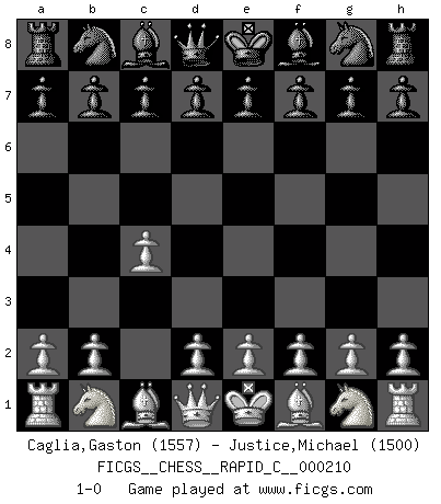 Last move : 1-0 2019 May 30 22:44:9 [Event "FICGS__CHESS__RAPID_C__000210"] [Site "FICGS"] [Date "2019.04.30"] [Round "1"] [White "Caglia,Gaston"] [Black "Justice,Michael"] [Result "1-0"] [WhiteElo "1557"] [BlackElo "1500"] 1.c4 1-0 This chess game has been lost on time (started : 2019.04.30 12:53:3) English Opening Player White won this chess game. Follow this game move after move (download)I had a toothache during the first game. In the second game I had a headache. In the third game it was an attack of rheumatism. In the fourth game, I wasn't feeling well. And in the fifth game? Well, must one have to win every game ? (Siegbert Tarrasch) Deine Wertungszahl - vorausgesetzt einige Jahre schachliche Anstrengung - entspricht etwa dem zehnfachen Deines IQ plus 1000. (Jonathan Levitt) En el Ajedrez, tal como es jugado por los Maestros, practicamente la suerte es eliminada. (Emanuel Lasker) Il n'y a pas eu de défaite parce que je ne crois pas que cet ordinateur ait jamais existé. IBM a triché en refusant d'imprimer les modes de recherche de la machine. C'est évident, pendant le match, des coups décisifs ont été joués par des êtres humains. Aujourd'hui, les meilleurs spécialistes en informatique ne peuvent toujours pas expliquer comment Deep-Blue a pu jouer contre la logique des ordinateurs. IBM a gagné une guerre de communication, mais ils sont incapables de prouver que l'ordinateur a gagné tout seul. (Garry Kasparov) At last I discovered the true beauty of chess. So I proposed to her. (Dinesh De Silva)