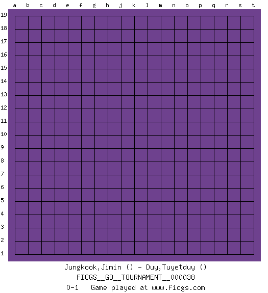 Last move : 0-1 2019 May 30 22:44:9 [Event "FICGS__GO__TOURNAMENT__000038"] [Site "FICGS"] [Date "2019.04.30"] [Round "1"] [Black "Jungkook,Jimin"] [White "Duy,Tuyetduy"] [Result "0-1"] 0-1 This go game has been lost on time (started : 2019.04.30 19:56:27) Here are the names of the openings (joseki) played in the four corners : Player White won this Go (weiqi, baduk) game. Follow this game move after move (download)Don't be greedy ! (Anonymous) If only faces could talk... (Pat Summerall, Sportscaster during the Super Bowl)
