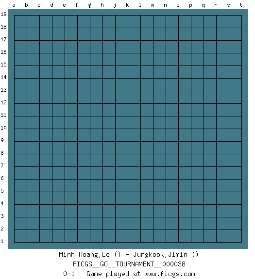 Last move : 0-1 2019 May 30 22:44:9 [Event "FICGS__GO__TOURNAMENT__000038"] [Site "FICGS"] [Date "2019.04.30"] [Round "1"] [Black "Minh Hoang,Le"] [White "Jungkook,Jimin"] [Result "0-1"] 0-1 This go game has been lost on time (started : 2019.04.30 19:56:27) Here are the names of the openings (joseki) played in the four corners : Player White won this Go (weiqi, baduk) game. Follow this game move after move (download)Atari, atari is vulgar play. (Anonymous) Begin at the beginning and go on till you come to the end; then stop. (Lewis Carrol, Alice in Wonderland)