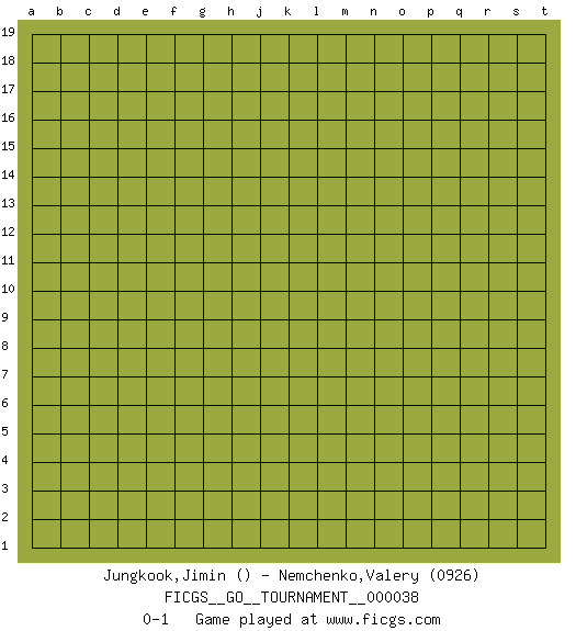 Last move : 0-1 2019 May 30 22:44:9 [Event "FICGS__GO__TOURNAMENT__000038"] [Site "FICGS"] [Date "2019.04.30"] [Round "1"] [Black "Jungkook,Jimin"] [White "Nemchenko,Valery"] [Result "0-1"] [Rating 2 "0926"] 0-1 This go game has been lost on time (started : 2019.04.30 19:56:27) Here are the names of the openings (joseki) played in the four corners : Player White won this Go (weiqi, baduk) game. Follow this game move after move (download)The saki bottle shape is negative. (Anonymous) As a goal marker shodan is important. As a destination it is a poor place to stop. (Thomas Tamayo)