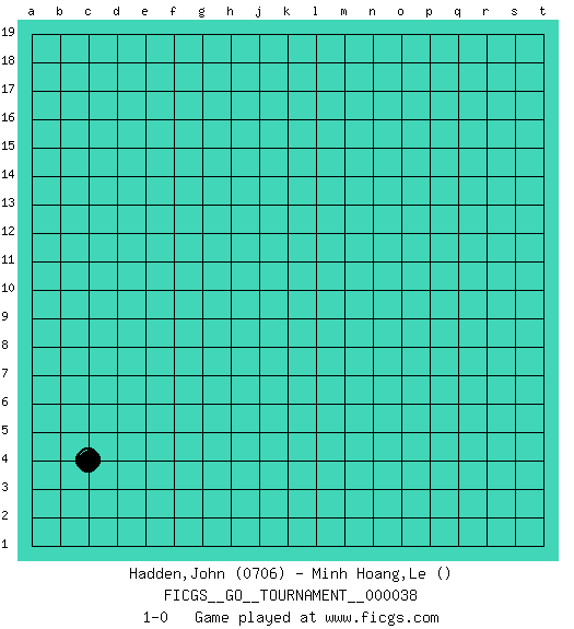Last move : 1-0 2019 May 31 10:45:38 [Event "FICGS__GO__TOURNAMENT__000038"] [Site "FICGS"] [Date "2019.04.30"] [Round "1"] [Black "Hadden,John"] [White "Minh Hoang,Le"] [Result "1-0"] [Rating 1 "0706"] 1.c4 1-0 This go game has been lost on time (started : 2019.04.30 19:56:27) Here are the names of the openings (joseki) played in the four corners : Corner d4 : c4 1-0 Komoku (Somok, Xiao~mu`) 3-4 Point. The komoku (3-4) point is the traditional corner enclosure move.. Player Black won this Go (weiqi, baduk) game. Follow this game move after move (download)The possibility or impossibility of an event results logically from the rules. (Pierre Audouard) The ego is not master in its own house. (Sigmund Freud)