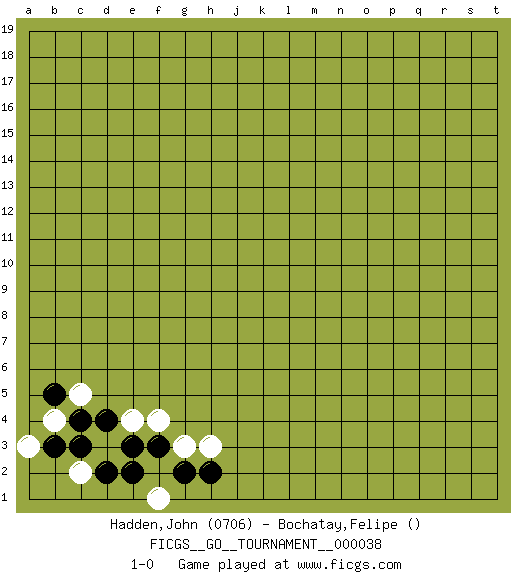 Last move : 1-0 2019 June 23 8:2:56 [Event "FICGS__GO__TOURNAMENT__000038"] [Site "FICGS"] [Date "2019.04.30"] [Round "1"] [Black "Hadden,John"] [White "Bochatay,Felipe"] [Result "1-0"] [Rating 1 "0706"] 1.c4 e4 2.e3 d3 3.f3 g3 4.g2 f1 5.e2 h3 6.h2 f4 7.d2 c2 8.c3 b4 9.d4 c5 10.b3 a3 11.b5 1-0 This go game has been lost on time (started : 2019.04.30 19:56:27) Here are the names of the openings (joseki) played in the four corners : Corner d4 : c4 e4 Komoku (Somok, Xiao~mu`) 3-4 Point. The komoku (3-4) point is the traditional corner enclosure move.. Ikken Takagakari (Hankan Nop'dakeolch'im, Yi Gaogua`jiao~, 1-Space High Approach). The 5-4 approach move has become more popular in modern times, as modern Go emphasizes speed and influence. Player Black won this Go (weiqi, baduk) game. Follow this game move after move (download)Keep inessential ataris till the end. (Anonymous) In every real man a child is hidden that wants to play. (Friedrich Nietzsche)
