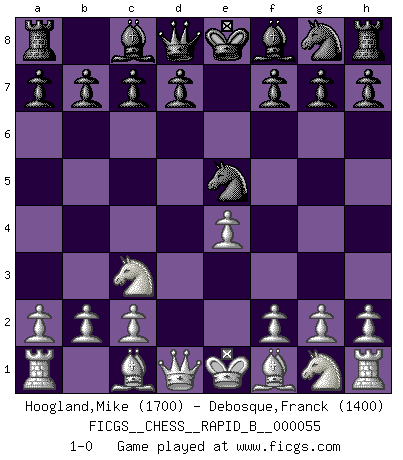 Last move : 1-0 2007 August 14 9:33:11 [Event "FICGS__CHESS__RAPID_B__000055"] [Site "FICGS"] [Date "2007.06.10"] [Round "1"] [White "Hoogland,Mike"] [Black "Debosque,Franck"] [Result "1-0"] [WhiteElo "1700"] [BlackElo "1400"] 1.d4 Nc6 2.e4 e5 3.dxe5 Nxe5 4.Nc3 1-0 This chess game has been lost on time (started : 2007.06.10 23:57:46) Queen's pawn : Lundin (Kevitz-Mikenas) defense Player White won this chess game. Follow this game move after move (download)One of these modest little moves may be more embarrassing to your opponent than the biggest threat. (Siegbert Tarrasch) Im Wettkampf zwischen starken Meistern kommen Fehler sehr selten vor, deshalb ist es mit bloßem Warten nicht getan. (José Raúl Capablanca) No es suficiente ser un buen jugador, se debe también de jugar bién. (Siegbert Tarrasch) Toute estimation doit être constamment réévaluée. (Jacob Estrin) The age of a woman doesn't mean a thing. The best tunes are played on the oldest fiddles. (Ralph Waldo Emerson)