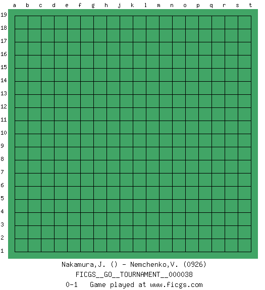 Last move : 0-1 2019 May 30 22:44:9 [Event "FICGS__GO__TOURNAMENT__000038"] [Site "FICGS"] [Date "2019.04.30"] [Round "1"] [Black "Nakamura,Jinhiko"] [White "Nemchenko,Valery"] [Result "0-1"] [Rating 2 "0926"] 0-1 This go game has been lost on time (started : 2019.04.30 19:56:27) Here are the names of the openings (joseki) played in the four corners : Player White won this Go (weiqi, baduk) game. Follow this game move after move (download)Don't get surrounded ! Ever ! (Anonymous) When you don't know what to do, walk fast and look worried. (Anonymous)