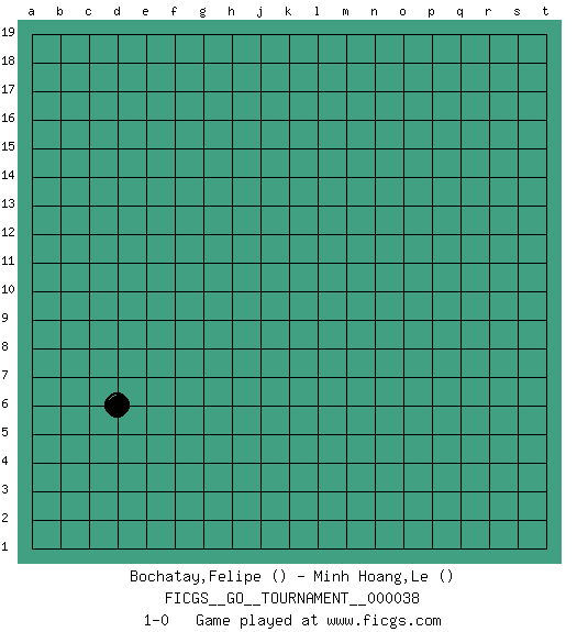 Last move : 1-0 2019 May 30 22:44:9 [Event "FICGS__GO__TOURNAMENT__000038"] [Site "FICGS"] [Date "2019.04.30"] [Round "1"] [Black "Bochatay,Felipe"] [White "Minh Hoang,Le"] [Result "1-0"] 1.d6 1-0 This go game has been lost on time (started : 2019.04.30 19:56:27) Here are the names of the openings (joseki) played in the four corners : Corner d4 : d6 1-0 Ootakamoku (Chaogao) 6-4 Point. The large takamoku (high) point (6-4), experimented with during the "new fuseki" movement in Japan in the 1930's. This point is seldom played as the initial corner point nowadays. Player Black won this Go (weiqi, baduk) game. Follow this game move after move (download)At the head of two stones in a row, play hane. (Anonymous) If you don't practice you don't deserve to win. (Andre Agassi)