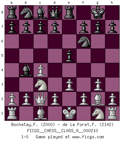 Last move : 1-0 2019 June 30 6:35:8 [Event "FICGS__CHESS__CLASS_A__000210"] [Site "FICGS"] [Date "2019.04.30"] [Round "1"] [White "Bochatay,Felipe"] [Black "de la Foret,Fred"] [Result "1-0"] [WhiteElo "2000"] [BlackElo "2142"] 1.c4 e5 2.g3 Nf6 3.Nc3 Bb4 4.Bg2 O-O 5.Qc2 Re8 6.e3 1-0 This chess game has been lost on time (started : 2019.04.30 20:34:48) English Opening Kingside Castling by player Black (move 4) Player White won this chess game. Follow this game move after move (download)Becoming successful at Chess allows you to discover your own personality. That's what I want for the kids I teach. (Saudin Robovic) Ein Isolani verdüstert die Stimmung auf dem ganzen Schachbrett. (Savielly Grigorievitsch Tartakower) Sin errores no puede haber brillantez. (Emanuel Lasker) Dans le domaine de la peinture, de la gravure et de la sculpture, dès la première décennie de notre siècle, les artistes abandonnent la représentation de la partie d'échecs pour se concentrer sur les pièces, sur les échiquiers et sur toutes les variations auxquelles les unes et les autres peuvent donner lieu. On passe en quelque sorte d'un thème social à un thème musical (au sens de la musica médiévale, c'est-à-dire d'une notion qui inclue le rythme, l'harmonie, la construction et la déconstruction, etc.). Graphiquement et picturalement, l'échiquier apparaît comme une structure ouverte, dynamique, d'une richesse infinie, autorisant toutes les combinatoires et débouchant sur des mouvements et des rythmes de nature exponentielle. (Michel Pastoureau) Establishing goals is all right if you don't let them deprive you of interesting detours. (Doug Larson)