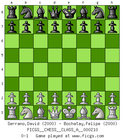 Last move : 0-1 2019 June 10 7:53:58 [Event "FICGS__CHESS__CLASS_A__000210"] [Site "FICGS"] [Date "2019.04.30"] [Round "1"] [White "Serrano,David"] [Black "Bochatay,Felipe"] [Result "0-1"] [WhiteElo "2000"] [BlackElo "2000"] 0-1 This chess game has been lost on time (started : 2019.04.30 20:34:48) Player Black won this chess game. Follow this game move after move (download)Up to this point White has been following well-known analysis. But now he makes a fatal error: he begins to use his own head. (Siegbert Tarrasch) Bis jetzt ist Weiß einer wohlbekannten Analyse gefolgt. Aber jetzt begeht er einen schrecklichen Fehler: Er beginnt seinen eigenen Kopf zu benutzen. (Siegbert Tarrasch) Al jugar al Ajedrez entonces, podemos aprender: Primero: Previsión... Segundo: Prudencia... Tercero: Cautela... Y al final, aprendemos del Ajedrez el hábito de no ser desanimados por apariencias malas presentes en el estado de nuestros asuntos, el hábito de la esperanza por una oportunidad favorable y la perseveración de los secretos de los recursos. (Benjamin Franklin) Vous savez, camarade Pachman, je n'éprouve pas de plaisir à être ministre, je jouerais plutôt aux échecs comme vous, ou alors ferais une révolution au Venezuela. (Che Guevara à Ludek Pachman, 'Checkmate in Prague', 1975) When I took office, only high energy physicists had ever heard of what is called the World Wide Web... Now even my cat has its own page. (Bill Clinton, 1996)
