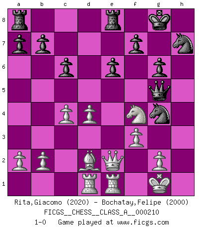 Last move : 1-0 2019 August 7 14:57:9 [Event "FICGS__CHESS__CLASS_A__000210"] [Site "FICGS"] [Date "2019.04.30"] [Round "1"] [White "Rita,Giacomo"] [Black "Bochatay,Felipe"] [Result "1-0"] [WhiteElo "2020"] [BlackElo "2000"] 1.e4 c6 2.d4 d5 3.Nc3 dxe4 4.Nxe4 Bf5 5.Ng3 Bg6 6.Nf3 Nd7 7.Bd3 Ngf6 8.O-O e6 9.Re1 Be7 10.c4 O-O 11.Bxg6 hxg6 12.Qe2 Re8 13.Bd2 Nh7 14.Rad1 Ndf6 15.h4 Ng4 16.h5 gxh5 17.Nxh5 g6 18.Nf4 Bg5 19.Nxg5 Qxg5 20.f3 1-0 This chess game has been lost on time (started : 2019.04.30 20:34:48) Caro-Kann : Classical variation Kingside Castling by player White (move 8) Kingside Castling by player Black (move 10) Player White won this chess game. Follow this game move after move (download)I played Chess with him and would have beaten him sometimes only he always took back his last move, and ran the game out differently. (Mark Twain) Wenn sie aufgeben, dann danke ich Ihnen für das Spiel (Eventualzug beim Fernschach). (Anonymous) Debemos de asegurarnos de que el Ajedrez no se convierta en un lenguaje muerto, muy interesante, pero tan solo para un grupo muy pequeño. (Sytze Faber) Les erreurs sont comme les malheurs, elles n'arrivent jamais seules. (Siegbert Tarrasch) Methinks King Thibault should dub Marius Zubac a knight of the square board... I mean table, henceforth addressing him as Sir Marius, and bestow on him a suitable land from the kingdom of FICGS & marry him off to a worthy, fair maiden, lest he slice our heads with his mighty sword in his wrath. (Dinesh De Silva)