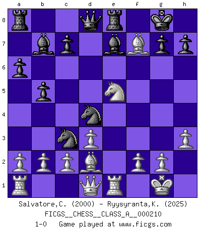Last move : 1-0 2019 May 8 6:49:12 [Event "FICGS__CHESS__CLASS_A__000210"] [Site "FICGS"] [Date "2019.04.30"] [Round "1"] [White "Salvatore,Carmine"] [Black "Ryysyranta,Kaaleppi"] [Result "1-0"] [WhiteElo "2000"] [BlackElo "2025"] 1.e4 e5 2.Nf3 Nc6 3.Bb5 a6 4.Ba4 Nf6 5.O-O Be7 6.Re1 b5 7.Bb3 O-O 8.h3 Bb7 9.d3 d5 10.exd5 Nxd5 11.Nxe5 Nd4 12.Bd2 Re8 13.Nc3 Nxc3 14.Bxf7+ 1-0 Ruy Lopez : Closed, 7...O-O Kingside Castling by player White (move 5) Kingside Castling by player Black (move 7) Player White won this chess game. Follow this game move after move (download)Chess is imagination. (David Bronstein) Am wohlsten fühle ich mich, wenn ich sehe, wie sich mein Gegner im Todeskampf windet. (Robert James Fischer) Bobby es el jugador de Ajedrez mas fino que este país jamás haya producido. Su memoria para las movidas, su brillantez en soñar combinaciones y su feróz determinación por la victoria son algo extraño. (John Collins) La vie et les Echecs sont tous les deux une lutte constante. (Lasker) May the force be with you. (Han Solo in Star Wars ep.4)