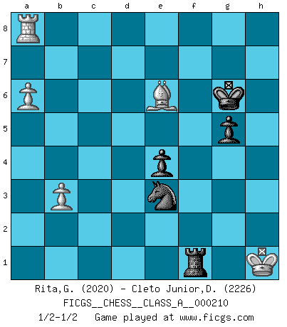 Last move : 1/2-1/2 2019 August 2 20:2:33 [Event "FICGS__CHESS__CLASS_A__000210"] [Site "FICGS"] [Date "2019.04.30"] [Round "1"] [White "Rita,Giacomo"] [Black "Cleto Junior,Dirceu"] [Result "1/2-1/2"] [WhiteElo "2020"] [BlackElo "2226"] 1.e4 d6 2.d4 Nf6 3.Nc3 g6 4.Nf3 Bg7 5.Be2 O-O 6.O-O c6 7.a4 Qc7 8.Be3 e5 9.d5 Nbd7 10.Nd2 cxd5 11.exd5 a6 12.Nc4 Ng4 13.Ne4 Nxe3 14.fxe3 Rd8 15.Rxf7 Kxf7 16.Ng5+ Ke7 17.Ne6 Qb8 18.Nxg7 Rg8 19.Ne6 Nf6 20.Nb6 Bxe6 21.dxe6 Qc7 22.Nxa8 Rxa8 23.Qd3 Kxe6 24.Rd1 Ke7 25.Bf3 Rb8 26.g4 a5 27.b3 Rf8 28.h3 b6 29.Kg2 Nd7 30.Qd2 Nf6 31.c3 h6 32.Qd3 Qc5 33.Rd2 Rf7 34.Rf2 Nd7 35.Rf1 Rf8 36.Rd1 Nf6 37.Rd2 g5 38.Rd1 Rd8 39.c4 Kf7 40.Kf1 Kg7 41.Ke2 Qa3 42.Qc2 Rf8 43.Bd5 Qc5 44.Be4 h5 45.gxh5 Nxh5 46.Kd3 Kh6 47.Qg2 Nf6 48.Ke2 d5 49.Bxd5 Qa3 50.c5 bxc5 51.Bc4 Nh5 52.Qd5 Rf6 53.Ke1 Qb4+ 54.Rd2 Qc3 55.Qd3 Qxd3 56.Rxd3 e4 57.Rd5 Rf3 58.Ke2 Rxh3 59.Rxc5 Nf6 60.Rxa5 Rh2+ 61.Ke1 Rh1+ 62.Kf2 Ng4+ 63.Kg2 Ra1 64.Be6 Ra2+ 65.Kh3 Nxe3 66.Ra6 Kg7 67.a5 Rf2 68.Ra8 Rf3+ 69.Kh2 Kg6 70.a6 Rf2+ 71.Kg3 Rf3+ 72.Kh2 Rf2+ 73.Kh1 Rf1+ 1/2-1/2 Pirc : Classical system, 5.Be2 Kingside Castling by player Black (move 5) Kingside Castling by player White (move 6) 10 pieces endgame at move 65 : White KRBPP , Black KRNPP WHITE : King + 1 Rook 1 Bishop 2 Pawns BLACK : King + 1 Rook 1 Knight 2 Pawns This chess game ended in a draw. Follow this game move after move (download)The beauty of a move lies not in its' appearance but in the thought behind it. (Siegbert Tarrasch) Es ist peinlich, dass ich nie Weltmeister wurde. Es wäre leicht, Leonid Breschnjew als Ursache vorzuschieben, dessen Apparat den Vorzeigekommunisten Anatoli Karpow in allem unterstützte. Aber Garri Kasparow zum Beispiel, der ebenfalls von den Sowjets unerwünscht war, hat trotz der Widerstände den WM-Titel erobert. (Viktor Kortschnoi) Si el ingenio solamente fuese necesario para lucirse, las mujeres serían las mejores jugadoras de Ajedrez del mundo. (Albin) Seul un grand joueur sait à quel point il joue faiblement. (Xavier Tartacover) Never risk one's whole fortune unless supported by one's entire army. (Niccolo Machiavelli)