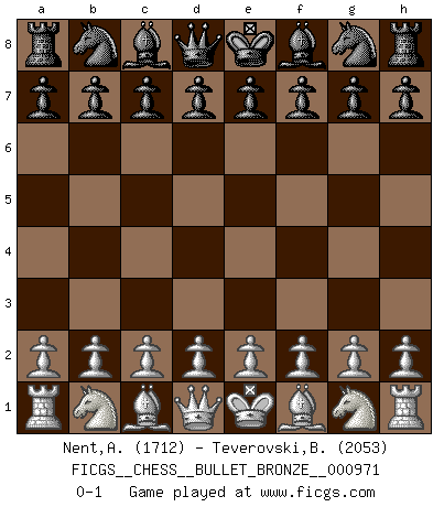 Last move : 0-1 2019 May 3 9:42:8 [Event "FICGS__CHESS__BULLET_BRONZE__000971"] [Site "FICGS"] [Date "2019.05.03"] [Round "1"] [White "Nent,Alexander"] [Black "Teverovski,Bogoljub"] [Result "0-1"] [WhiteElo "1712"] [BlackElo "2053"] 0-1 This chess game has been lost on time (started : 2019.05.03 9:6:43) Player Black won this chess game. Follow this game move after move (download)Methodical thinking is of more use in Chess than inspiration. (C. J. S. Purdy) Die westlichen Werte sind eine Sprache, welche die Putin-Administration nicht versteht. (Garry Kasparov) El Ajedrez es como la guerra en un tablero. (Bobby Fischer) 'L'échange des dames est un coup dur pour les deux adversaires...' Un journaliste lors d'une partie du match Spassky-Fischer I fear not the man who has practiced 10,000 kicks once, but I fear the man who has practiced one kick 10,000 times. (Bruce Lee)