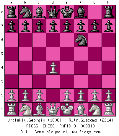 Last move : 0-1 2019 June 5 11:11:30 [Event "FICGS__CHESS__RAPID_B__000319"] [Site "FICGS"] [Date "2019.05.05"] [Round "1"] [White "Uralskiy,Georgiy"] [Black "Rita,Giacomo"] [Result "0-1"] [WhiteElo "1608"] [BlackElo "2214"] 1.d4 Nf6 0-1 This chess game has been lost on time (started : 2019.05.05 3:44:11) Queen's pawn game Player Black won this chess game. Follow this game move after move (download)Chess teaches you to control the initial excitement you feel when you see something that looks good and it trains you to think objectively when you're in trouble. (Stanley Kubrick) Capablanka war das größte Genie der Schachgeschichte! Aber denken sie nicht er habe nichts vom Schach verstanden. Er wusste nur soviel wie er wissen musste um seine Ziele zu erreichen. (Mikhail Moiseyevich Botvinik) Yo he agregado estos principios a la ley: pongan los Caballos en acción antes de que los dos Alfiles sean desarrollados. (Emanuel Lasker) Aucun coup ne doit être joué sans but. (Pedro Damiano) Somewhere in the world there is an epigram for every dilemma. (Hendrik Willem van Loon)