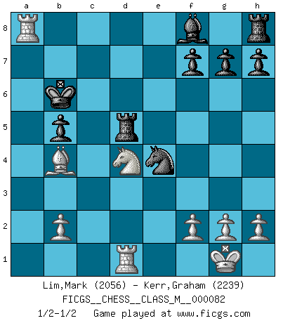 Last move : 1/2-1/2 2019 October 3 3:45:45 [Event "FICGS__CHESS__CLASS_M__000082"] [Site "FICGS"] [Date "2019.05.05"] [Round "1"] [White "Lim,Mark"] [Black "Kerr,Graham"] [Result "1/2-1/2"] [WhiteElo "2056"] [BlackElo "2239"] 1.d4 d5 2.Nf3 Nf6 3.c4 c6 4.e3 Bf5 5.Nc3 a6 6.Nh4 Bd7 7.Bd3 Bg4 8.Qb3 b5 9.cxd5 cxd5 10.O-O Nc6 11.Bd2 e5 12.Bf5 exd4 13.Bxg4 Nxg4 14.Qxd5 Qxd5 15.Nxd5 O-O-O 16.e4 Nge5 17.a4 Kb7 18.axb5 axb5 19.Rfd1 Nd7 20.Nf3 Nc5 21.Nb4 Nxb4 22.Bxb4 Nxe4 23.Ra5 Kb6 24.Nxd4 Rd5 25.Ra8 1/2-1/2 Queen's pawn game Kingside Castling by player White (move 10) Queenside Castling by player Black (move 15) This chess game ended in a draw. Follow this game move after move (download)Pawn endings are to Chess what putting is to golf. (Cecil Purdy) Ich hatte Angst gegen einen russischen Großmeister zu verlieren, und er befürchtete gegen einen kleinen Jungen zu verlieren. (über ein Remis gegen Juri Awerbach). (Robert James Fischer) Solo existe una cosa que Fischer hace en el Ajedrez sin placer: ¡perder!. (Boris Spassky) C'est une question de caractère, Beaucoup de gens perdent leur motivation très vite. D'autres, ils sont rares, peuvent la conserver très longtemps. J'aime les échecs, encore aujourd'hui je suis heureux d'analyser des parties. J'aime toujours gagner, je déteste encore perdre. Bien jouer est important pour mon intégrité intellectuelle et morale. Et puis les échecs vivent en ce moment une période historique grâce à Internet. Ils se développent dans les systèmes éducatifs à travers le monde. Ils sortent de leur ghetto, et c'est mon rôle de mener à bien cette révolution. (Gary Kasparov) The various flowers seem good to different people. (Chinese proverb)