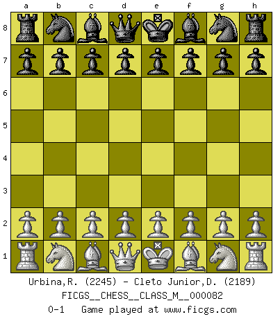 Last move : 0-1 2019 June 14 15:14:15 [Event "FICGS__CHESS__CLASS_M__000082"] [Site "FICGS"] [Date "2019.05.05"] [Round "1"] [White "Urbina,Ricardo"] [Black "Cleto Junior,Dirceu"] [Result "0-1"] [WhiteElo "2245"] [BlackElo "2189"] 0-1 This chess game has been lost on time (started : 2019.05.05 6:19:55) Player Black won this chess game. Follow this game move after move (download)First-class players lose to second class players because second-class players sometimes play a first-class game. (Tarrasch) Der Schachmeister von Heute braucht Courage, einen Killerinstinkt, Ausdauer und Arroganz. (Larry Evans) Ciertamente, de todas la drogas del mundo, el Ajedrez debe ser el mas placentero permamentemente. (Assiac) RxDa4 pat (...) Without enthusiasm, virtue functions not at all, and vice only poorly. (Mignon McLaughlin, The Neurotic's Notebook, 1960)