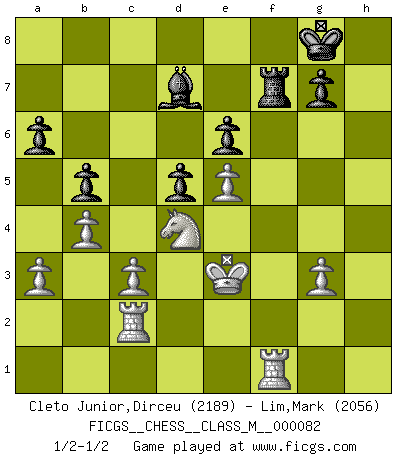 Last move : 1/2-1/2 2019 August 24 22:26:27 [Event "FICGS__CHESS__CLASS_M__000082"] [Site "FICGS"] [Date "2019.05.05"] [Round "1"] [White "Cleto Junior,Dirceu"] [Black "Lim,Mark"] [Result "1/2-1/2"] [WhiteElo "2189"] [BlackElo "2056"] 1.e4 e6 2.d4 d5 3.Nc3 Nf6 4.e5 Nfd7 5.f4 c5 6.Nf3 Nc6 7.Be3 a6 8.Qd2 b5 9.dxc5 Bxc5 10.Bd3 Qb6 11.Bf2 Bxf2+ 12.Qxf2 Qxf2+ 13.Kxf2 Nb6 14.Ne2 O-O 15.c3 Bd7 16.Rhe1 Na4 17.b3 Nc5 18.Ke3 f6 19.Ned4 Rac8 20.Rac1 fxe5 21.Nxe5 Nxe5 22.fxe5 Nxd3 23.Kxd3 Rf2 24.Re2 Rf7 25.b4 h5 26.Ke3 Rcf8 27.g3 h4 28.a3 hxg3 29.hxg3 Rf1 30.Rec2 R8f7 31.Rxf1 1/2-1/2 French : Steinitz, Boleslavsky variation Kingside Castling by player Black (move 14) This chess game ended in a draw. Follow this game move after move (download)Personally, I rather look forward to a computer program winning the world Chess Championship. Humanity needs a lesson in humility. (Richard Dawkings) Ich würde mich als ganz normalen Jungen bezeichnen [Im Alter von 12]. (Sergej Karjakin) El pensamiento metódico es mas útil en el Ajedrez que la inspiración. (C. J. S. Purdy) Lorsque vous vous retrouvez devant une position atroce, ne tendez pas un ultime piège dérisoire avec l'intention d'abandonner si l'adversaire le déjoue ! Faites-vous plutôt un devoir de résister comme si votre vie en dépendait. Jouez le coup qui vous déplairait au centuple si vous étiez dans la peau de votre tortionnaire ! For a mechanic, you seem to do an excessive amount of thinking. (C-3PO in Star Wars ep.2)