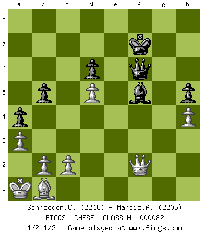 Last move : 1/2-1/2 2019 July 2 13:24:30 [Event "FICGS__CHESS__CLASS_M__000082"] [Site "FICGS"] [Date "2019.05.05"] [Round "1"] [White "Schroeder,Christoph"] [Black "Marciz,Alexander"] [Result "1/2-1/2"] [WhiteElo "2218"] [BlackElo "2205"] 1.e4 c5 2.Nc3 Nc6 3.Nge2 g6 4.d4 cxd4 5.Nxd4 Bg7 6.Be3 Nf6 7.Bc4 O-O 8.Bb3 d6 9.f3 Bd7 10.Qd2 Rc8 11.O-O-O Nxd4 12.Bxd4 b5 13.Nd5 Nxd5 14.Bxg7 Kxg7 15.exd5 a5 16.a3 Qb6 17.Rhe1 Rfe8 18.g4 f5 19.h3 Rb8 20.Qg5 Kg8 21.Rxe7 Rxe7 22.Qxe7 Qc7 23.Re1 a4 24.Ba2 Re8 25.Qh4 Rxe1+ 26.Qxe1 fxg4 27.fxg4 Qd8 28.Kb1 Qf6 29.Ka1 h5 30.gxh5 gxh5 31.h4 Kf7 32.Bb1 Bf5 33.Qf2 Kg6 34.Ka2 Kf7 35.Ka1 1/2-1/2 Sicilian : chameleon variation Kingside Castling by player Black (move 7) Queenside Castling by player White (move 11) This chess game ended in a draw. Follow this game move after move (download)Chess is as much a mystery as women. (Purdy) Im Wettkampf zwischen starken Meistern kommen Fehler sehr selten vor, deshalb ist es mit bloßem Warten nicht getan. (José Raúl Capablanca) Me dio la sensación de como si yo estuviera jugando en contra del mismo Ajedrez. - al estar jugando en contra de Robert Fischer (Walter Shipman) Toute estimation doit être constamment réévaluée. (Jacob Estrin) CHESS, n. f. [echecs, Fr.] A nice and abstruse game, in which two sets of puppets are moved in opposition to each other. (Dr Samuel Johnson, A Dictionary Of The English Language, 1755)