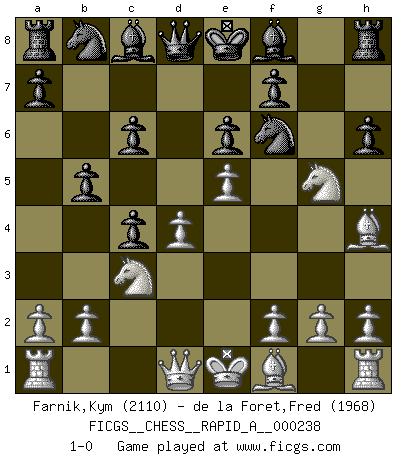 Last move : 1-0 2019 June 16 22:37:42 [Event "FICGS__CHESS__RAPID_A__000238"] [Site "FICGS"] [Date "2019.05.05"] [Round "1"] [White "Farnik,Kym"] [Black "de la Foret,Fred"] [Result "1-0"] [WhiteElo "2110"] [BlackElo "1968"] 1.d4 Nf6 2.c4 e6 3.Nf3 d5 4.Bg5 dxc4 5.Nc3 c6 6.e4 b5 7.e5 h6 8.Bh4 g5 9.Nxg5 1-0 This chess game has been lost on time (started : 2019.05.05 16:5:30) Queen's pawn game Player White won this chess game. Follow this game move after move (download)Up to this point White has been following well-known analysis. But now he makes a fatal error: he begins to use his own head. (Siegbert Tarrasch) Wir irren allesamt, nur jeder irrt anders. (Georg Christoph Lichtenberg) Cuando tengo las piezas blancas, yo gano porque soy blanco; Cuando tengo las piezas negras, yo gano porque soy Bogolyubov. (Bogolyubov) Comme les marins qui ont mille raisons différentes d'aller en mer, les joueurs d'échecs en ont tout autant avant de s'installer devant une table et jouer... (Vincent Bertignac, philosophe) Wisdom begins at the end. (Daniel Webster)