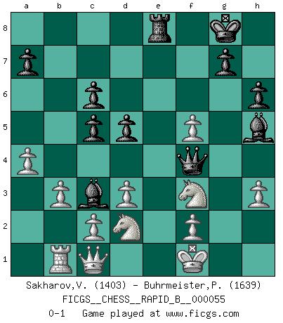Last move : 0-1 2007 July 5 22:13:25 [Event "FICGS__CHESS__RAPID_B__000055"] [Site "FICGS"] [Date "2007.06.10"] [Round "1"] [White "Sakharov,Vitalij"] [Black "Buhrmeister,Peter"] [Result "0-1"] [WhiteElo "1403"] [BlackElo "1639"] 1.e4 c5 2.Nf3 e6 3.a3 Nc6 4.Bc4 d5 5.exd5 exd5 6.Bb5 Nf6 7.Bxc6+ bxc6 8.O-O Be7 9.Re1 O-O 10.d3 Re8 11.Bg5 Bg4 12.h3 Bh5 13.Nbd2 Qc7 14.b3 h6 15.Bxf6 Bxf6 16.Rxe8+ Rxe8 17.Rb1 Bc3 18.g4 Bg6 19.Kg2 Qa5 20.a4 f5 21.gxf5 Bh5 22.Qc1 Qb4 23.Kf1 Qf4 0-1 Sicilian defense Kingside Castling by player White (move 8) Kingside Castling by player Black (move 9) Player Black won this chess game. Follow this game move after move (download)Chess is a fairy tale of 1001 blunders. (Savielly Tartakower) Wenn sie aufgeben, dann danke ich Ihnen für das Spiel (Eventualzug beim Fernschach). (Anonymous) Diferente gente reacciona diferentemente en aceptar la derrota. (Bobby Fischer) Mais n'est-ce pas déjà le limiter injurieusement que d'appeler les échecs un jeu? N'est-ce pas aussi une science, un art, ou quelque chose qui, comme le cercueil de Mahomet entre ciel et terre, est suspendu entre l'un et l'autre, et qui réunit un nombre incroyable de contraires ? (Stefan Zweig) Political correctness is subjecting us to gross incompetence. (Johann Piek)