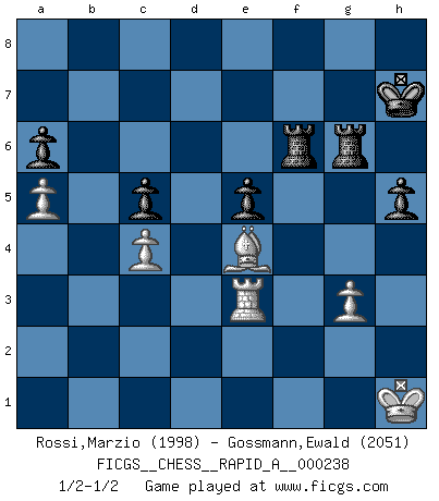 Last move : 1/2-1/2 2019 June 30 13:25:28 [Event "FICGS__CHESS__RAPID_A__000238"] [Site "FICGS"] [Date "2019.05.05"] [Round "1"] [White "Rossi,Marzio"] [Black "Gossmann,Ewald"] [Result "1/2-1/2"] [WhiteElo "1998"] [BlackElo "2051"] 1.d4 Nf6 2.c4 g6 3.Nc3 Bg7 4.e4 d6 5.Nf3 O-O 6.Be2 e5 7.O-O Na6 8.Re1 Bg4 9.Be3 Bxf3 10.Bxf3 exd4 11.Bxd4 Re8 12.Qd2 Nc5 13.Rad1 Ne6 14.Be3 Nd7 15.g3 a6 16.Be2 Bxc3 17.Qxc3 Qf6 18.Qc1 Qe7 19.f3 Rad8 20.Bf1 Ne5 21.Bg2 c5 22.f4 Nc6 23.Qd2 Ned4 24.Kh1 Qe6 25.Rc1 Qf6 26.b3 Qe6 27.b4 h5 28.h3 Kh7 29.Qc3 Rg8 30.a4 g5 31.fxg5 Ne5 32.Bf4 b6 33.h4 f6 34.gxf6 Rdf8 35.bxc5 bxc5 36.Bg5 Qg4 37.Rb1 Rg6 38.a5 Nef3 39.Re3 Nxg5 40.hxg5 Qxg5 41.e5 Nf5 42.Rbe1 dxe5 43.Be4 Nxe3 44.Qxe3 Qxe3 45.Rxe3 R8xf6 1/2-1/2 King's Indian : Orthodox variation Kingside Castling by player Black (move 5) Kingside Castling by player White (move 7) This chess game ended in a draw. Follow this game move after move (download)Bobby just drops the pieces and they fall on the right squares. (Miguel Najdorf) Je mehr wir mit Computern analysieren, desto mehr glauben wir an Verteidigung. (Vladimir Kramnik) Repentinamente, me resultaba obvio en mi analisis que yo había pasado por alto lo que Fischer había visto en el tablero con la mas grande facilidad. (Mikhail Botvinnik) Je ne suis pas le dernier à jouer lâchement des coups douteux pendant le zeïtnot de l'adversaire pour l'achever: en effet les coups qui font le plus peur sont ceux que l'on ne comprend pas. Je me fais souvent peur quand je joue. (Un professeur anonyme) As the days dwindle down... to a precious few. (Maxwell Anderson)